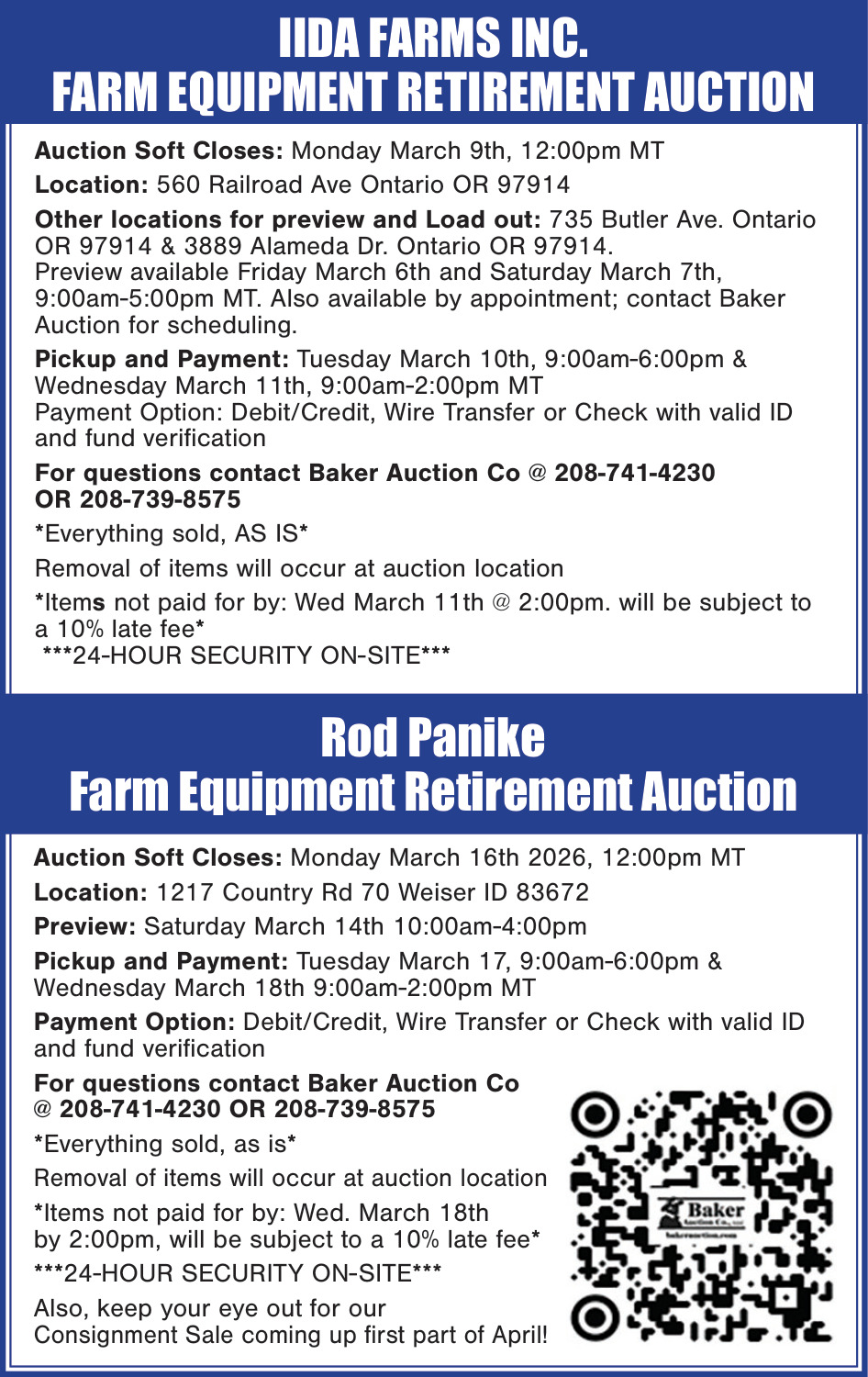 Mar 07, 2026. Baker Auction Co, LLC. Auction Ads from The Idaho Press