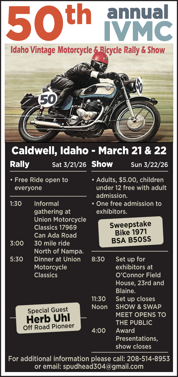 Mar 12, 2026. Idaho Vintage Motorcycle Club Events Ads from The Idaho Press